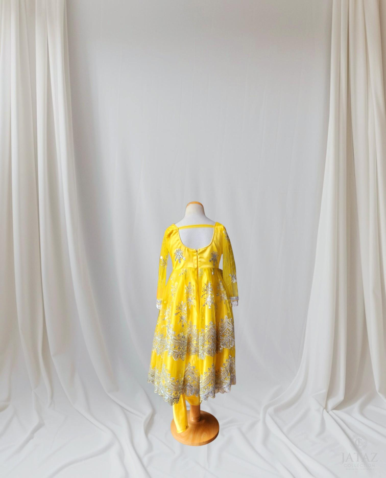 Beautiful 3 piece kids yellow Umbrella Kurtha sets featuring intricate thread and sequence work , satin salwar/pants and a matching net swal with silver thread and sequence detailing. Perfect for any occasion.
