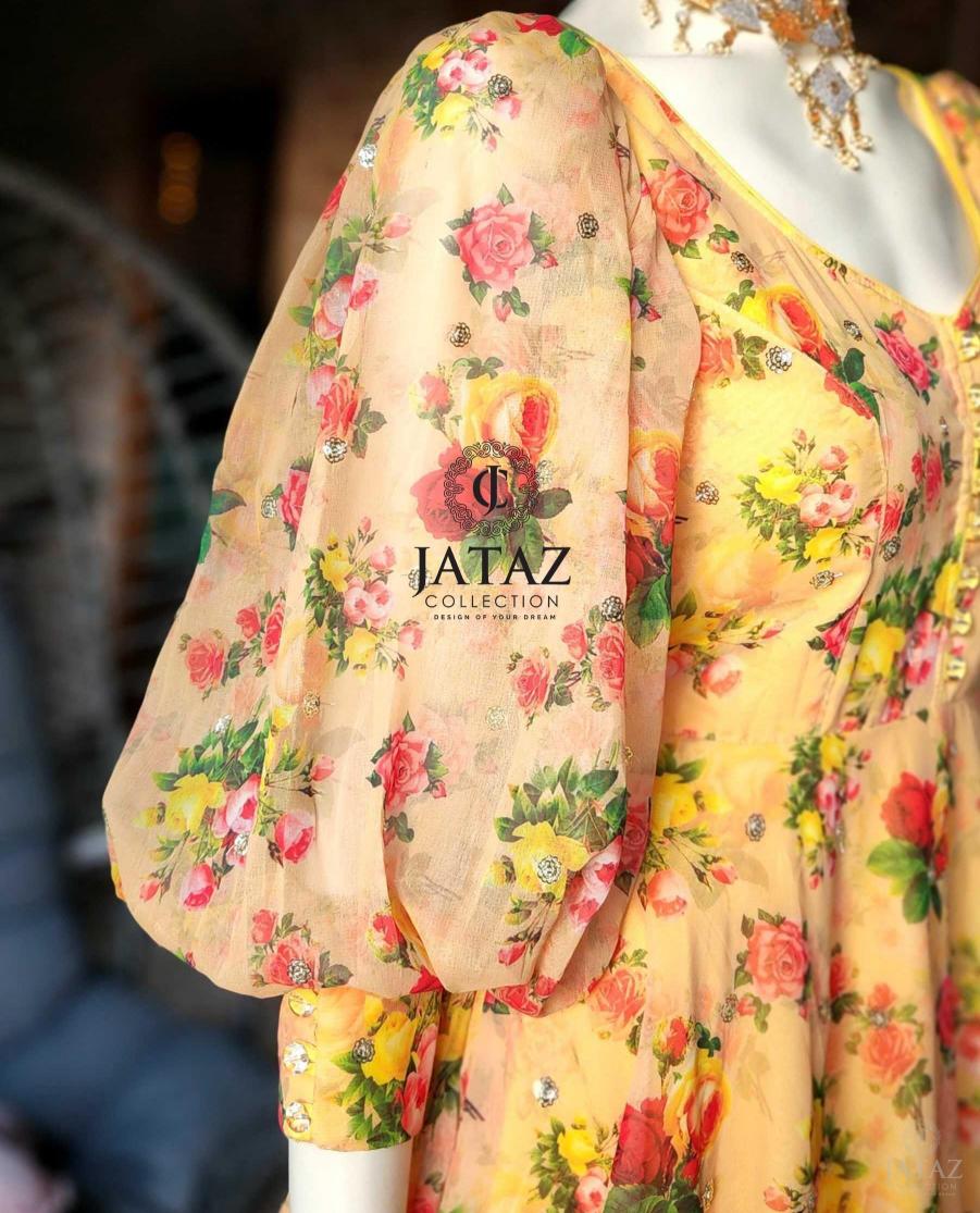 FLORAL YELLOW GEORGET GOWN WITH PUFF SLEEVE AND BEAUTIFUL BUTTON DESIGNS IN FRONT NECKLINE AND SLEEVES WITH WIDE V NECKLINES WITH BACK ZIPPER AND CANCAN INSIDE.