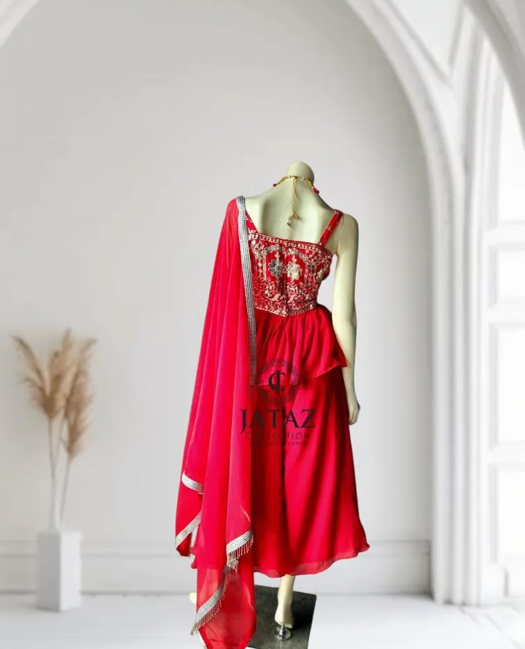 The outfit is completed with a matching red dupatta finished with a delicate silver border, adding just the right amount of sparkle. Perfect for weddings, festive celebrations, engagement parties, or special family events.