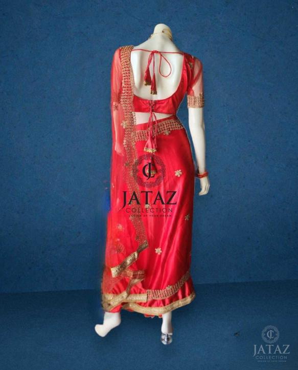 DESIGNER RED COMBINATION OF SATIN AND NET READY TO WEAR 1 MIN SAREE SET WITH PETICOAT ATTACHED .