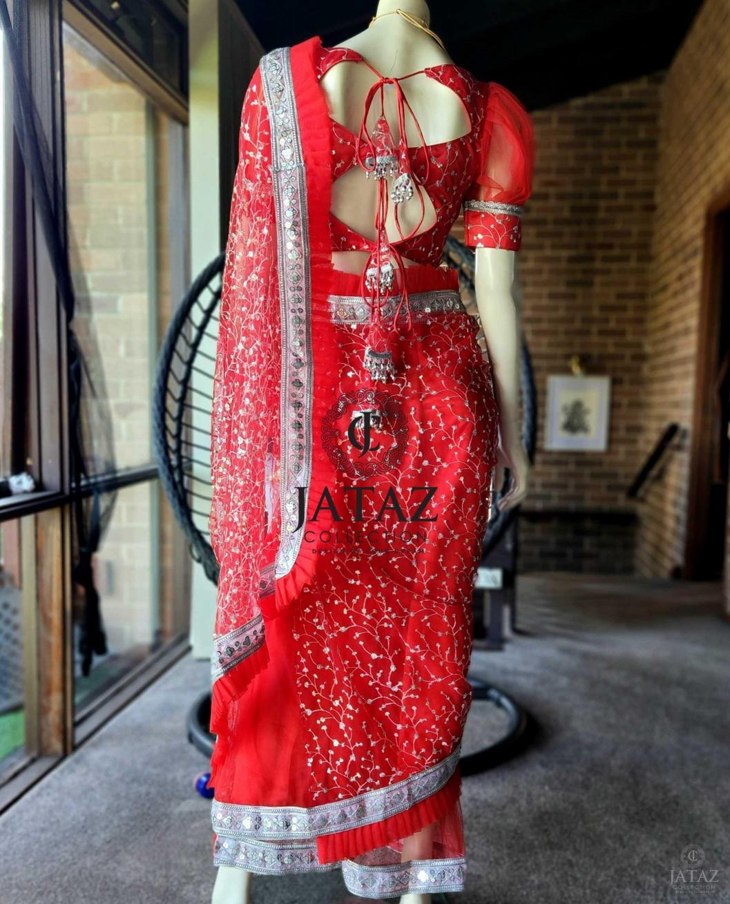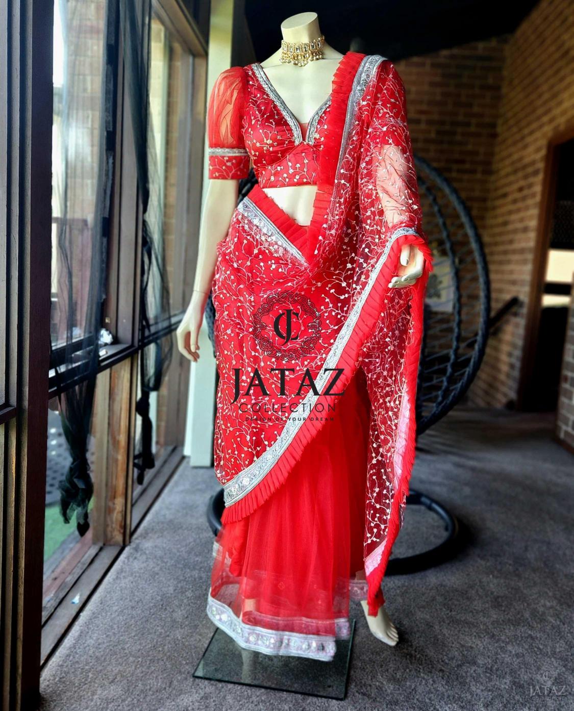 DESIGNER RED LAYERED SAREE WITH SILVER LACE BOARDER , THREAD AND SEQUENCE WORK BLOUSE