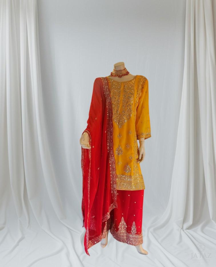 3 PIECE MUSTARD AND RED SHARARA SET (K0123)