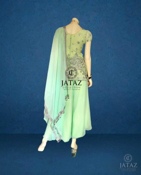 JATAZ BRINGS YOU 3 PIECE LIGHT GREEN SHARARA SET . TOP EMBELLISH WITH SILVER THREAD , SEQUENCE WORK AND FOAM ATTACHED . PLAIN GEORGET FABRIC PLAZZO WITH SWAL