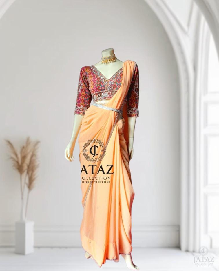 DESIGNER PEACH SAREE WITH HANDEMBROIDERY BLOUSE SET